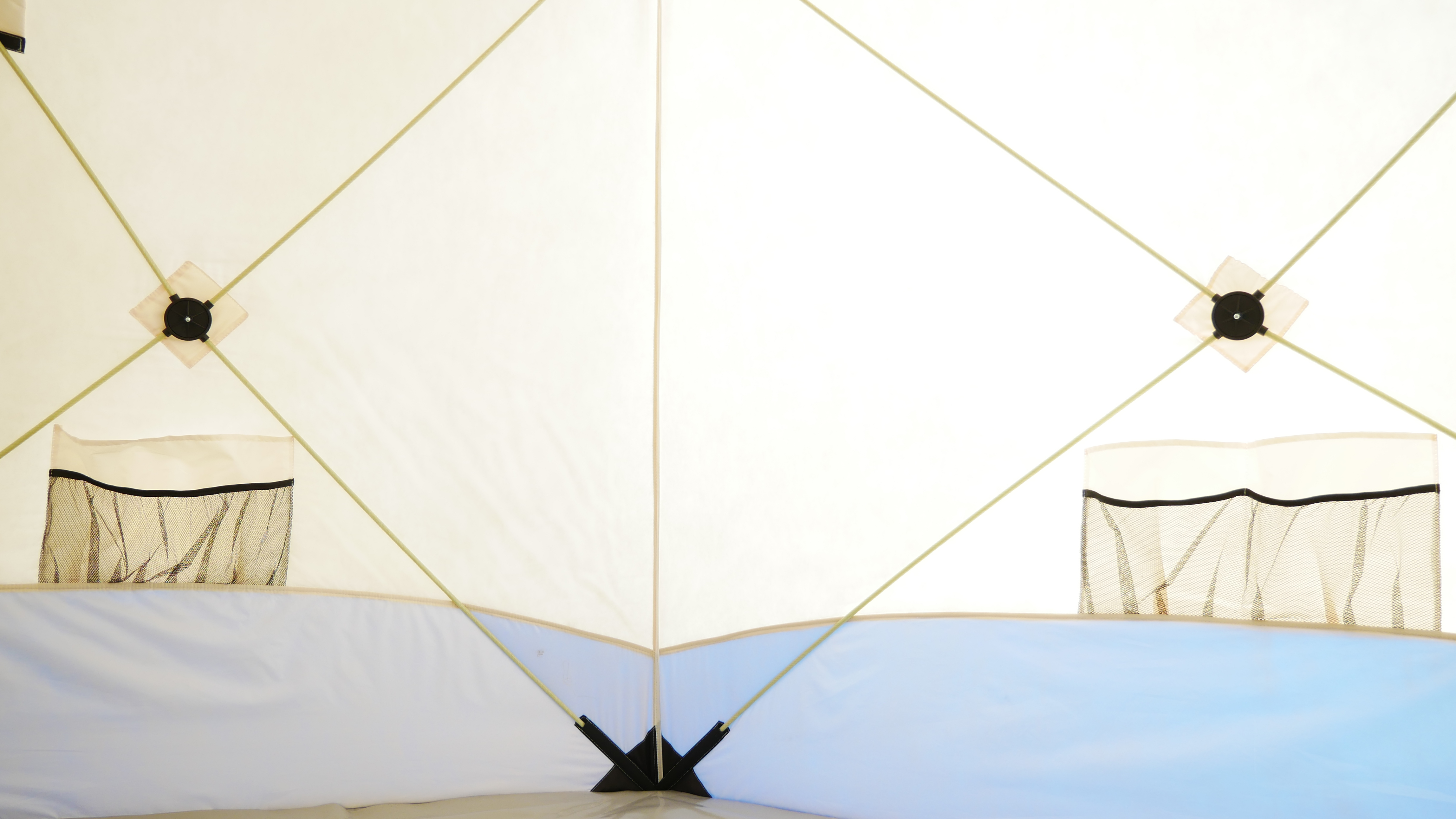 Внутреннее расположение карманов и сеток позволит разместить все необходимые вещи, которые будут всегда под рукой. Наличие 4х окон позволит удобно расположить отопление палатки.