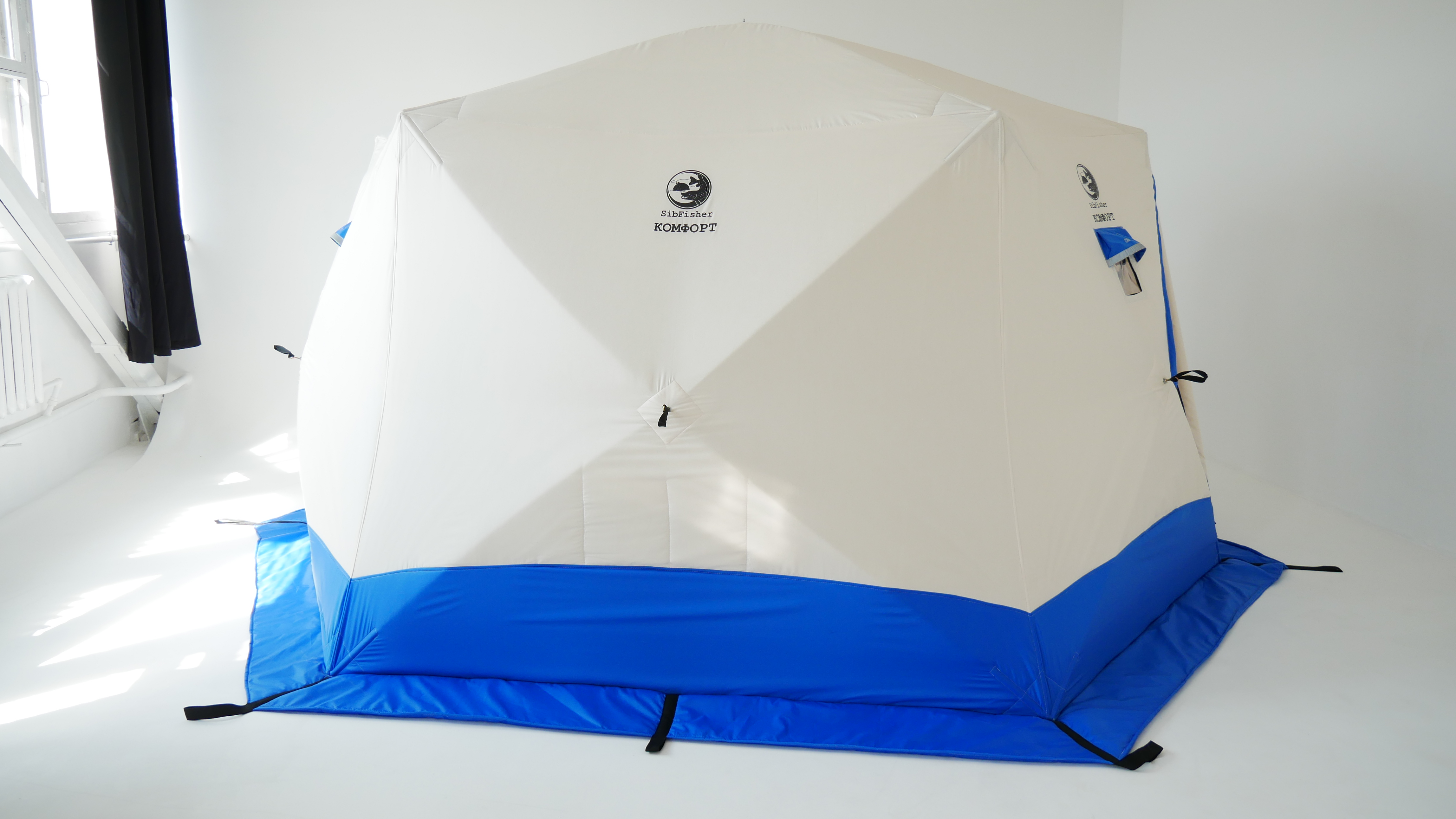 Палатка выполнена в светлых тонах и имеет светоотражающие элементы на двери и окнах, что позволяет увидеть палатку в ночное время. На наружной юбке имеются места крепления ко льду.